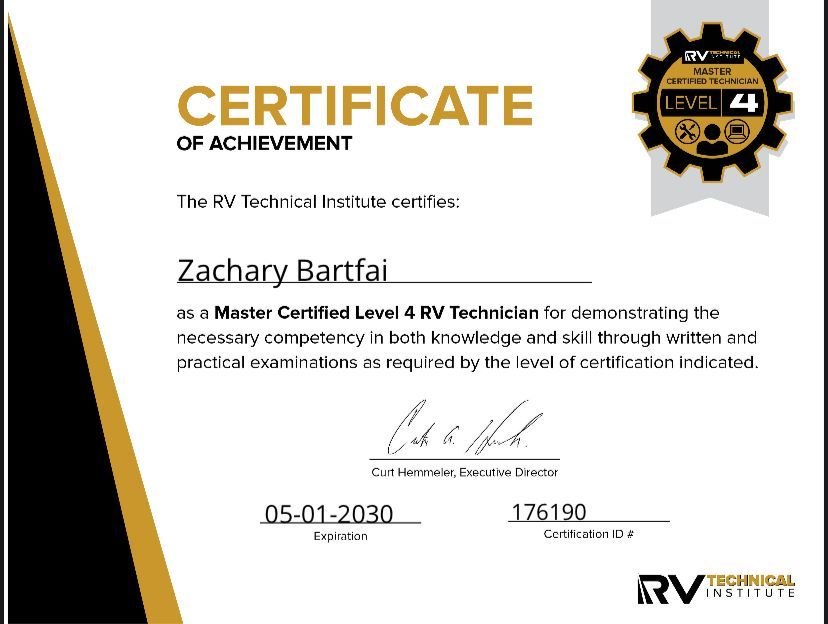 My name is Zach Bartfai, and I am a Certified RVTI Level 4 Master Certified Technician with extensive experience operating a Mobile RV service company. With over a decade in the industry, I bring years of professional automotive certifications from Ford Motor Company, complemented by countless hours of training from various RV manufacturers and industry suppliers. I am committed to maintaining my certifications through Continued Education Learning to enhance my ability to provide an exceptional customer experience. We proudly offer personalized service appointments to clients throughout Arizona. Based in Maricopa, I come from a large family, and family values are paramount to me; being a devoted dad stands as my most significant achievement. I genuinely care about people, which is why delivering outstanding service is so important to me.